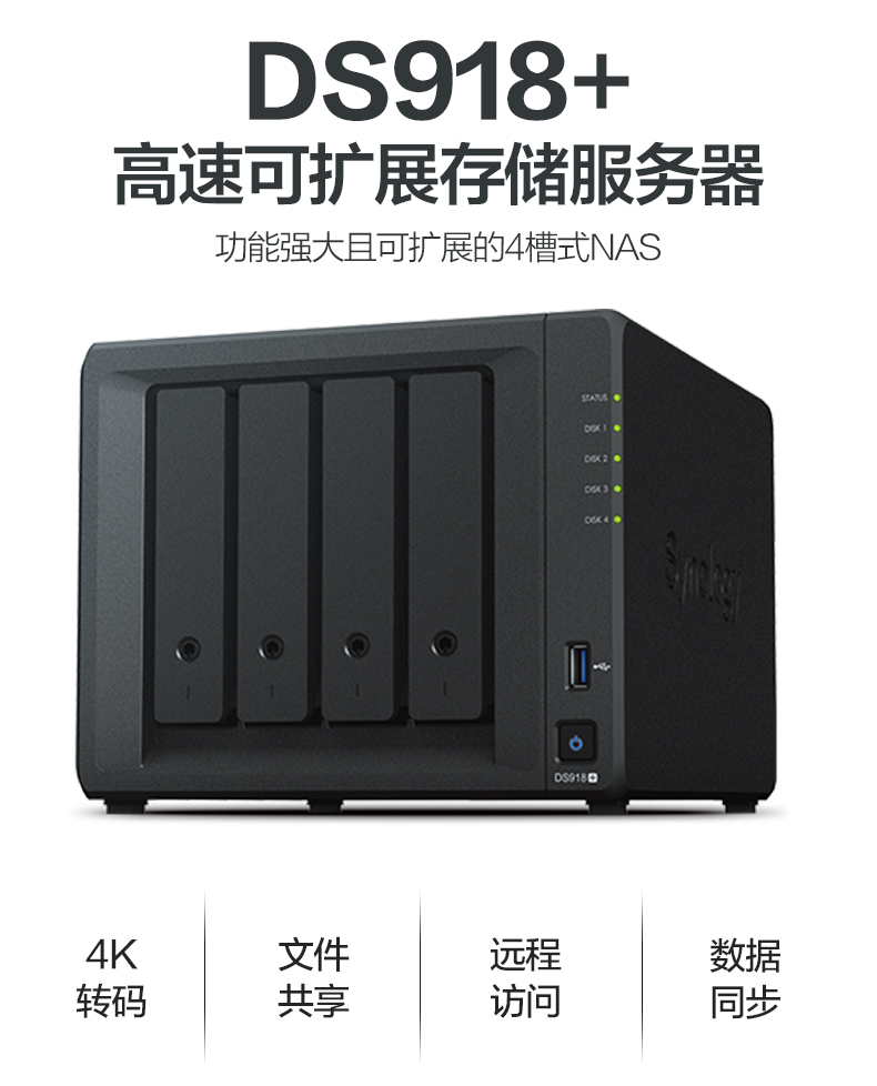 DS918+ 支持多達(dá)兩個(gè) M.2 NVMe 2280 SSD,無需占用內(nèi)部硬盤插槽即可快速創(chuàng)建系統(tǒng)緩存。DS918+ 可通過 Synology 擴(kuò)充設(shè)備 DX517 擴(kuò)展到多達(dá) 9 個(gè)硬盤,滿足了對(duì)靈活存儲(chǔ)容量的需求。