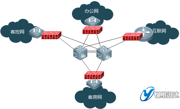 通過(guò)銳捷核心交換機(jī)的防火墻模塊的虛擬防火墻功能,對(duì)客控網(wǎng)、客房網(wǎng)、辦公網(wǎng)進(jìn)行安全防護(hù),將病毒/攻擊隔離在本地,不影響其他區(qū)塊正常運(yùn)行。