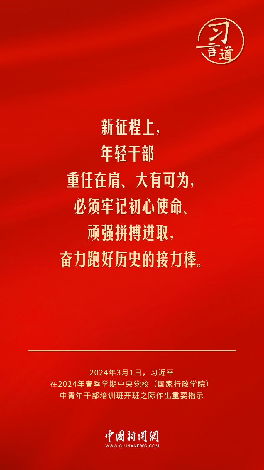 年輕干部是黨和國家事業(yè)發(fā)展的生力軍,是中國特色社會(huì)主義事業(yè)的接班人。3月1日,2024年春季學(xué)期中央黨校(國家行政學(xué)院)中青年干部培訓(xùn)班開班。習(xí)近平總書記作出重要指示。